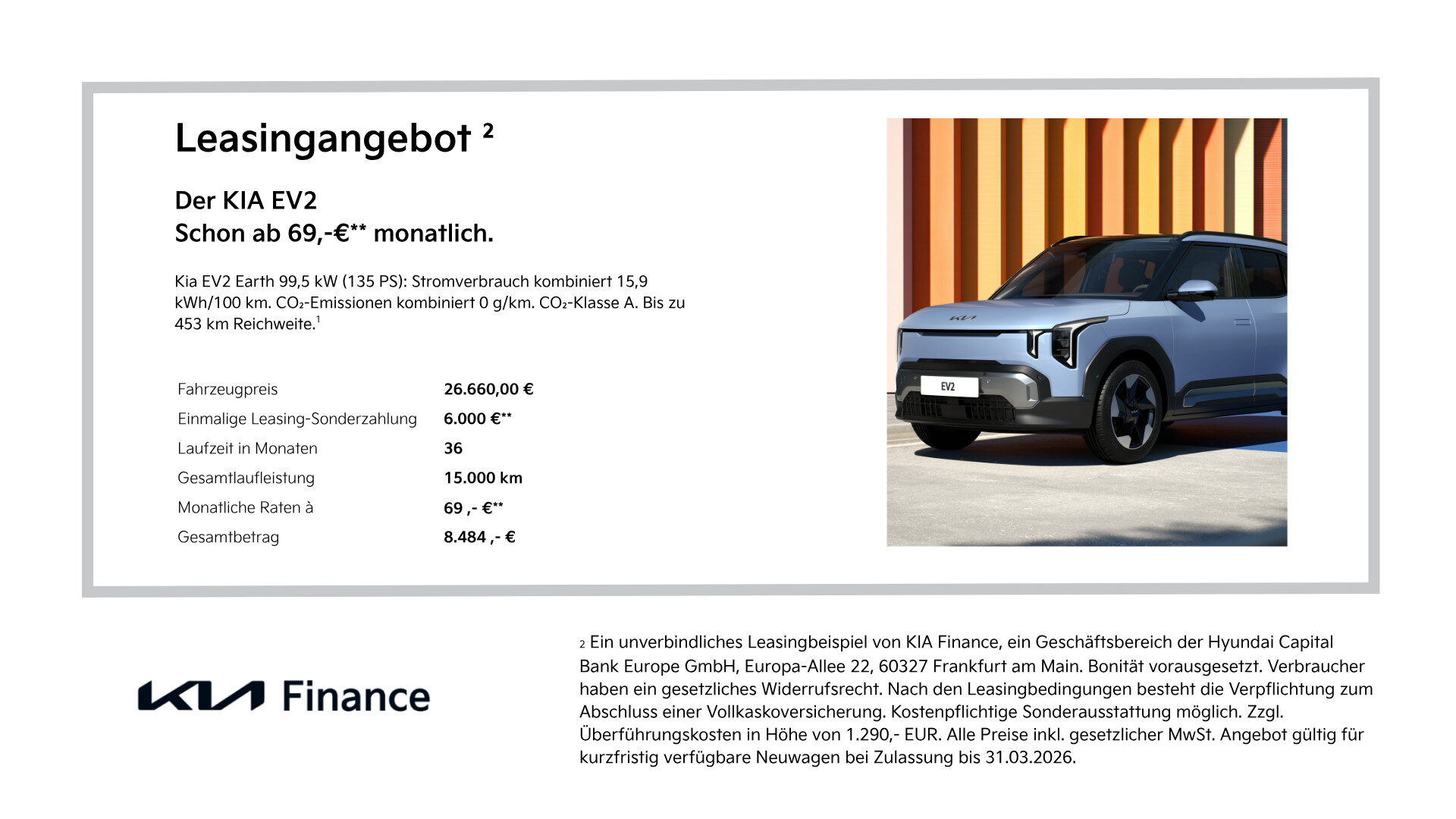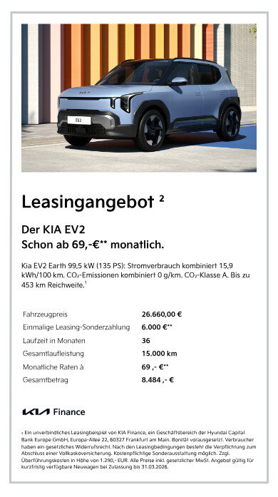 Du willst elektrisch fahren? Der Kia EV2 macht dir den Einstieg einfach. Kompakt, effizient und mit durchdachtem Raumkonzept bietet er alles, was du brauchst – bis zu 453 km Reichweite1 , 403 Litern Kofferraumvolumen und intuitive Konnektivität. Entdecke jetzt, wie unkompliziert Elektromobilität sein kann. Komm vorbei und mach deine erste Probefahrt bei uns.