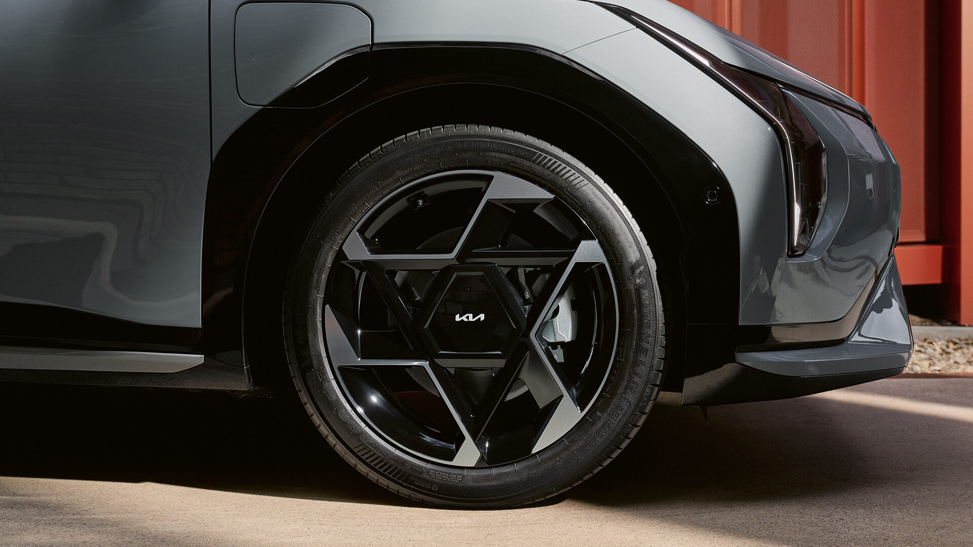 Markante Designelemente, wie die flügelartigen Front- und Heckstoßfänger sowie die einzigartigen 19“-Felgen mit dreieckigem Design, verleihen dem Kia EV4 GT-line eine besonders dynamische und futuristische Optik.