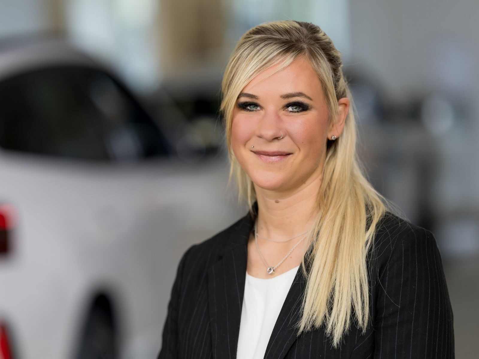 Kaltenbach Gruppe – Eine junge Frau mit heller Haut und zurückgebundenen braunen Haaren, die einen grauen Blazer und ein graues Oberteil trägt, steht in einem Innenraum in Kaltenbach Wermelskirchen mit unscharfen Autos im Hintergrund. Sie blickt in die Kamera und lächelt leicht. – BMW, MINI, KIA, BMW Motorrad & Honda Motorrad Partner in NRW